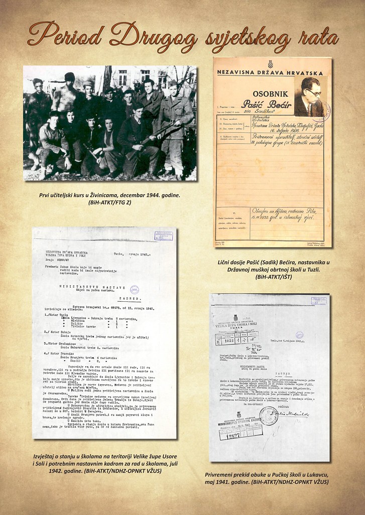 Pano prikazuje kontrastne aspekte obrazovanja tokom Drugog svjetskog rata kroz četiri različita dokumenta. S jedne strane, prikazuje se organizacija partizanske prosvjete fotografijom prvog učiteljskog kursa u Živinicama (decembar 1944.). S druge strane, dokumenti iz administracije NDH ilustruju svakodnevno funkcionisanje i probleme školstva pod tim režimom: lični dosije nastavnika, izvještaj o stanju i potrebama za nastavnim kadrom na teritoriji Velike župe Usora i Soli (juli 1942.), te naredbu o privremenom prekidu obuke u Pučkoj školi u Lukavcu (maj 1941.).