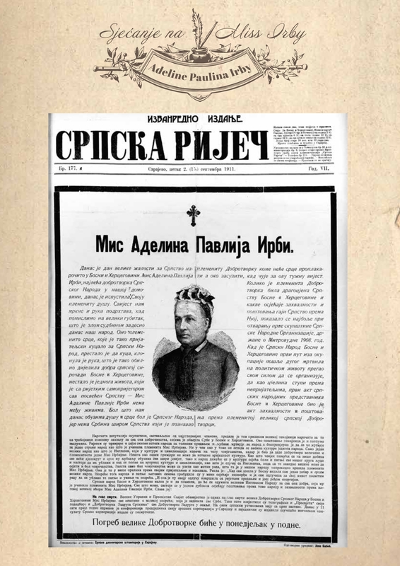 Drugi pano donosi naslovnu stranicu novina Srpska riječ, na kojem se nalazi tekst povodom smrti Miss Irby pod naslovom "Miss Adelina Pavlija Irbi"