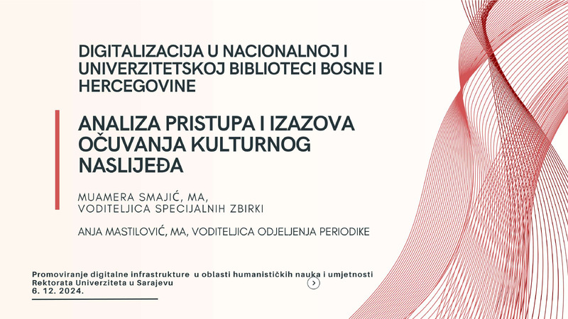 Muamera Smajić i Anja Mastilović, “Digitalizacija u Nacionalnoj i univerzitetskoj biblioteci Bosne i Hercegovine: analiza pristupa i izazova očuvanja kulturnog naslijeđa,” DARIAH-BiH, accessed September 30, 2025, https://dariahbih.unsa.ba/items/show/5.