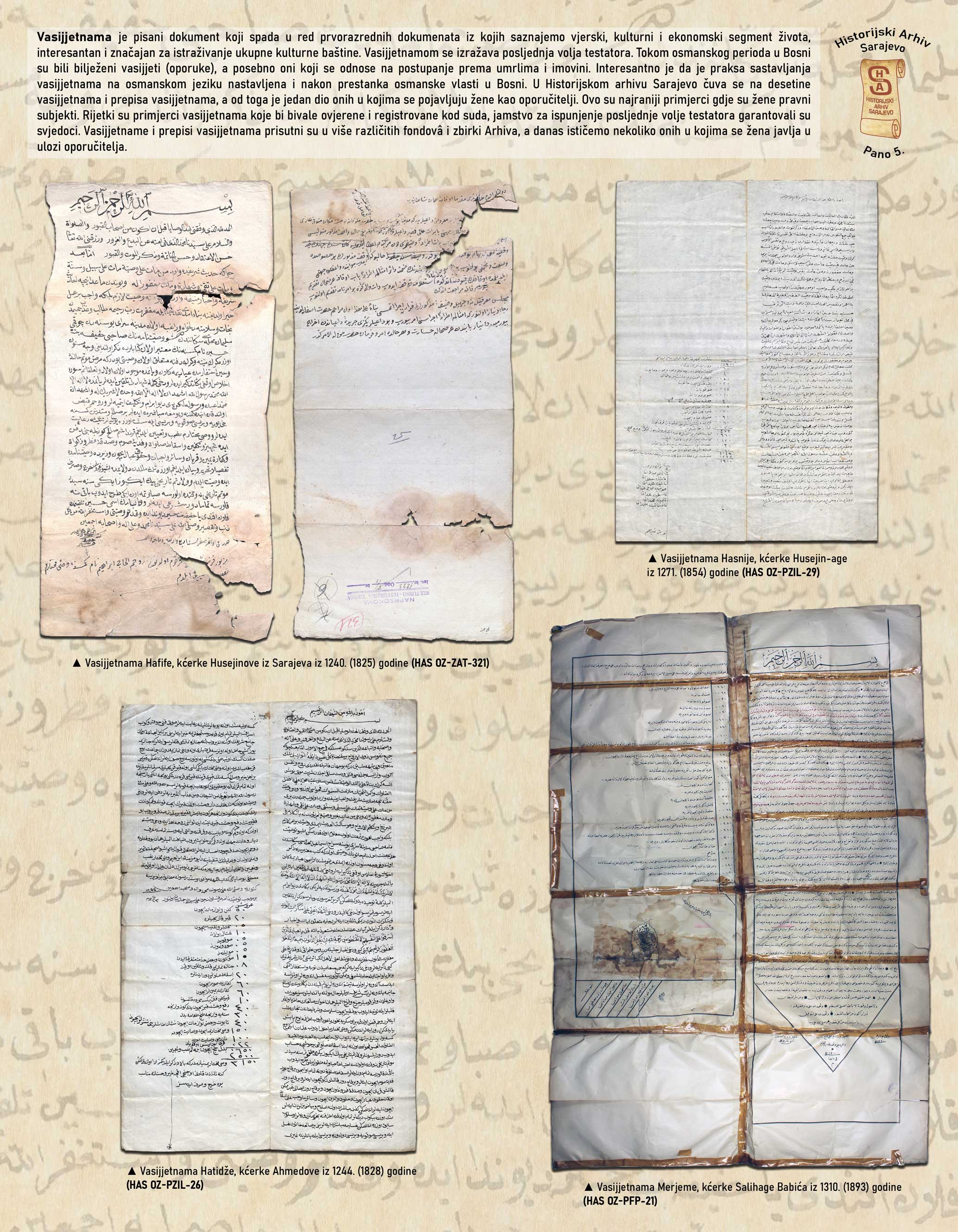 Na prvom panou izložbe "Femme Archival - Ženski glas iz Arhiva" predstavljena je selekcija dokumenata iz Zbirki i fondova na orijentalnim jezicima - Vasijjetname u kojima se javljaju žene kao oporučitelji (vasijjetname Hafife, Hasnije, Hatidže i Merjeme). Vasijjetnama je pisani dokument koji spada u red prvorazrednih dokumenata iz kojih saznajemo vjerski, kulturni i ekonomski segment života, interesantan i značajan za istraživanje ukupne kulturne baštine. Vasijjetnamom se izražava posljednja volja testatora...U Historijskom arhivu Sarajevo čuva se na desetine vasijjetnama i njihovih prijepisa. Ovo su najraniji primjerci gdje su žene pravni subjekti.