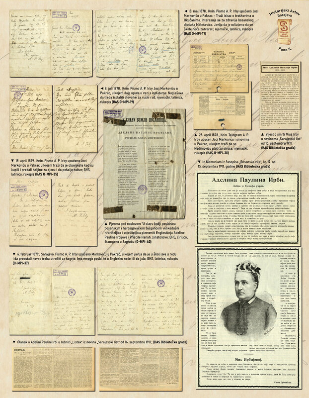 Na panou se vide arhivski dokumenti koji svjedoče o njenom djelovanju u Sarajevu, pisma koja je razmjenjivala sa Jocom Markovićem u Pakracu, pjesma pod naslovom "U slavu božji poslanica bosanskim i hercegovačkim bjeguncem velikodušni hraniteljica i utješiteljica plementi Engleskinja Adeline Pauline Irbijeve i Priscile Hanah Jonstonove", vijest o smrti Miss Irby u novinama, članak o Miss Irby.