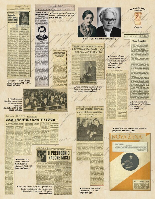 Vera Šnajder (djevojački Popović) bila je prva žena matematičarka u Bosni i Hercegovini i prva žena – dekan jednog fakulteta u Bosni i Hercegovini, ali i u tadašnjoj Jugoslaviji. Vera Šnajder zasigurno zauzima veoma značajno mjesto u bosanskohercegovačkoj naučnoj, ali i društvenoj historiji. Prije svega, tu je njena posebna ljubav i talenat za matematiku - naučnu oblast u kojoj je ostavila trajan pečat u Bosni i Hercegovini, a onda njena životna filozofija, opredjeljenost za napredni humanizam i racionalizam, kao baza za njenu potpunu posvećenost naučnom radu, a onda i pomaganju uspostavljanja naučnih institcija u Bosni i Hercegovini, pomaganju drugim nadarenim matematičarima, koji su kasnije postajali uspješni kadrovi u bosanskim privrednim gigantima kao što su „Energoinvest“, „Zrak“, „Unis“ i drugi. Vera Šnajder predstavlja svijetli primjer obazovane žene, intelektualke koja je postigla ogroman uspjeh kroz svoj trud i zalaganje, u društvenim okolnostima koje nisu bile obećavajuće, naročito u pogledu obrazovanja žena. Vera Šnajder je dokazala i pokazala kako se sve može postići, uz ispravnu motivaciju i iskrenu posvećenost radu. Kao čovjek, Vera Šnajder je ostala upamćena kao izuzetan pedagog, organizator, jako pravedna, beskompromisna i izvrsno obrazovana, govorila je više jezika, iako stroga, bila je omiljena među svojim studentima i saradnicima. Kroz cijeli svoj životni i radni vijek ostala je potpuno dosljedna nauci i humanosti čime je oplemenjivala sve oko sebe. Na panou se vide arhivalije iz fonda: isječci iz novina koji prate njen rad i intelekatualni angažman.