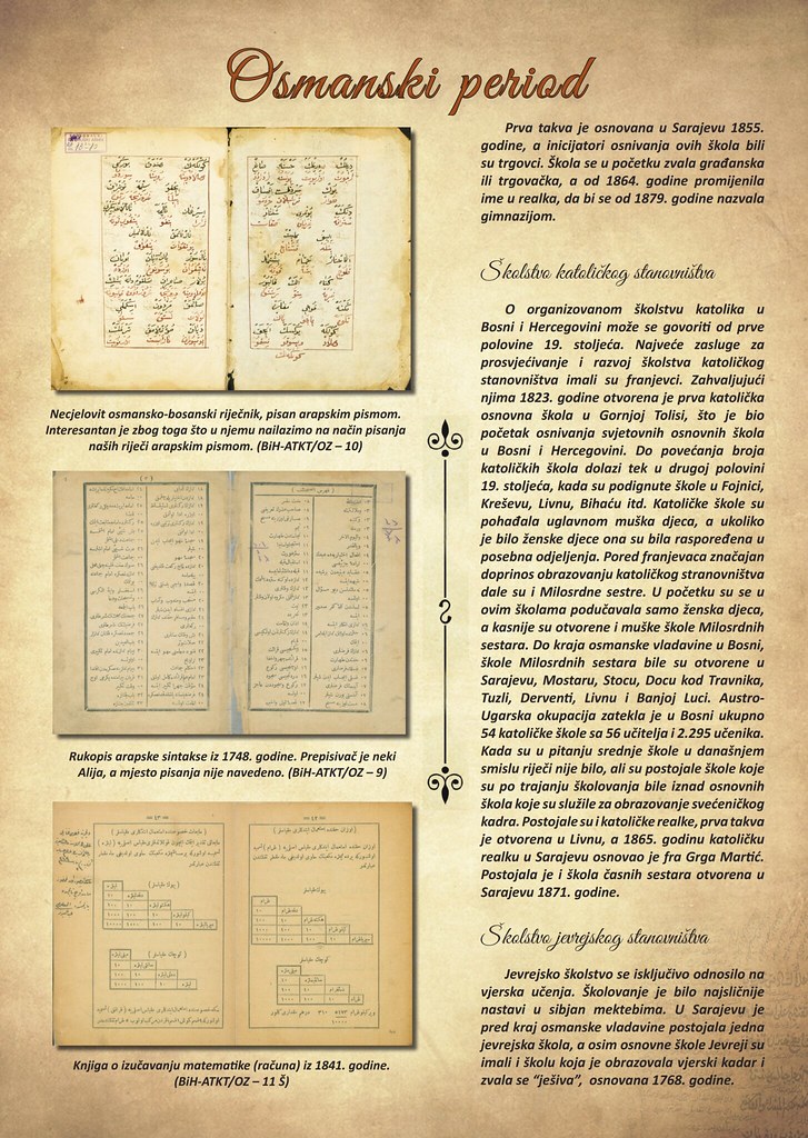 Pano detaljno obrađuje školstvo katoličkog i jevrejskog stanovništva u Bosni i Hercegovini tokom osmanskog perioda. Ističe ključnu ulogu franjevaca u prosvjećivanju katolika, s prvom katoličkom osnovnom školom otvorenom 1823. godine u Gornjoj Tolisi, što je bio i početak svjetovnog osnovnog školstva u BiH. Opisuje se i doprinos Milosrdnih sestara u obrazovanju, te osnivanje škola u Tuzli, Sarajevu, Mostaru, Derventi i drugim mjestima. Također se spominju i srednje škole poput katoličke realke. Školstvo jevrejskog stanovništva bilo je isključivo vjerskog karaktera, slično mektebima, a u Sarajevu je postojala i ješiva, osnovana 1768. godine. Pano je ilustrovan prikazima rijetkih dokumenata: necjelovitim osmansko-bosanskim rječnikom, rukopisom arapske sintakse iz 1748. godine, te knjigom o izučavanju matematike iz 1841. godine.
