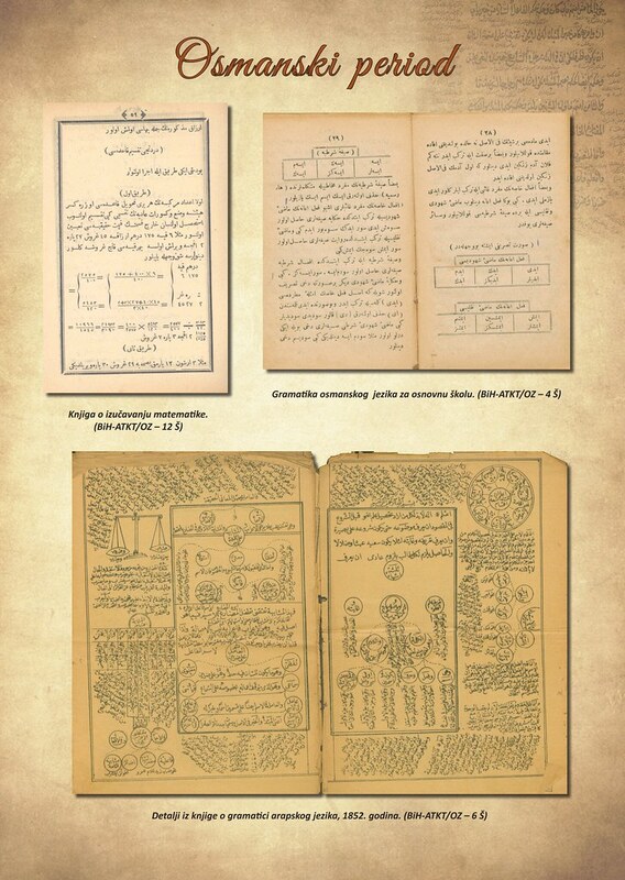 Ovaj pano vizualno predstavlja primjere udžbenika i obrazovnih materijala koji su se koristili u školama tokom osmanskog perioda u Bosni i Hercegovini. Na panou su izložene reprodukcije tri ključna dokumenta: