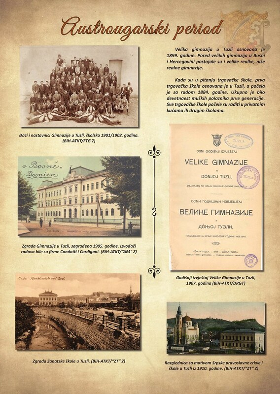 Ovaj pano se fokusira na osnivanje i razvoj značajnih obrazovnih institucija u Tuzli tokom austrougarskog perioda. Tekst ističe da je Velika gimnazija u Tuzli osnovana 1899. godine, a prva trgovačka škola 1884. godine. Pano je bogato ilustrovan historijskim fotografijama, razglednicama i dokumentima koji svjedoče o izgledu i radu ovih institucija. Prikazani su: