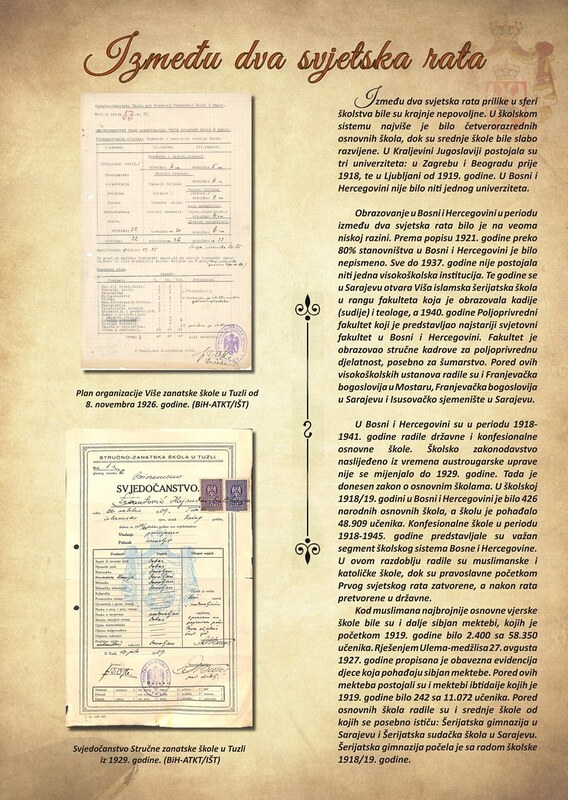 Pano opisuje izuzetno nepovoljne prilike u sferi školstva u Bosni i Hercegovini između dva svjetska rata. Ističe se visok nivo nepismenosti (preko 80% 1921. godine) i nedostatak visokoškolskih ustanova sve do 1937. godine, kada se osniva Viša islamska šerijatska škola, a 1940. i Poljoprivredni fakultet u Sarajevu. Školsko zakonodavstvo je naslijeđeno iz austrougarskog perioda sve do 1929. U ovom razdoblju rade državne i konfesionalne škole (muslimanske i katoličke). Pravoslavne škole su nakon Prvog svjetskog rata pretvorene u državne. Najbrojnije vjerske škole ostaju sibjan mektebi. Pano je ilustrovan sa dva dokumenta iz tuzlanskih škola: